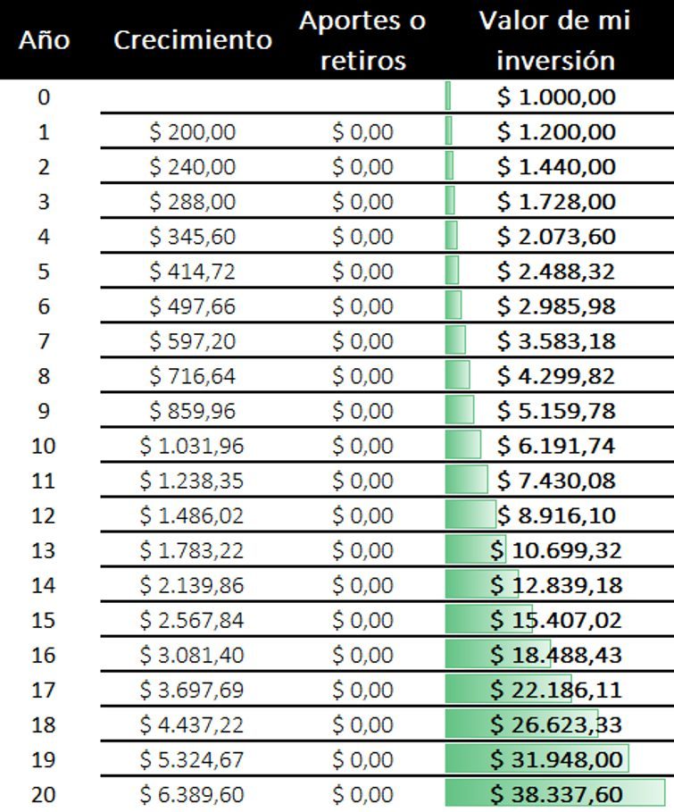 Esto te permitirá generar retornos extraordinarios en el largo plazo. Si en vez de reinvertir las ganancias, las retiraras, en 20 años tendrías $5000 ($1000 + $200 x 20 años). Pero como reinvertiste las utilidades, el capital al final de 20 años fue de $38.337. ¡Multiplicaste tu capital 38 veces!