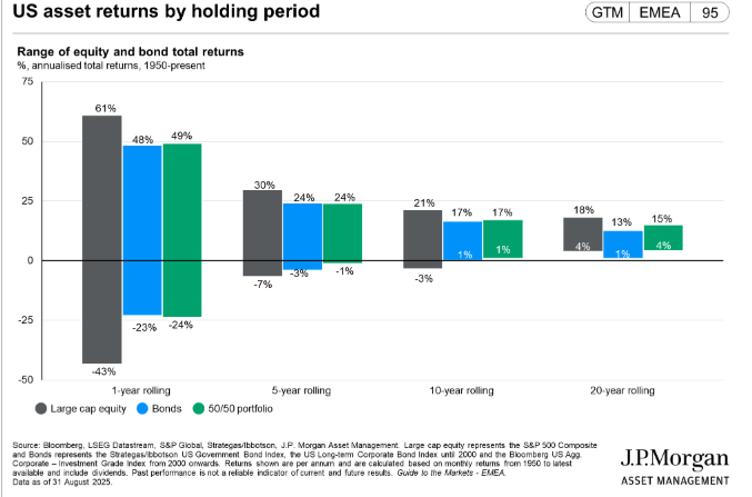 - Entre 1950 y hoy, si uno invertía en el S&P 500 durante un período de solo un año, los resultados podían ser muy dispares: hubo casos con pérdidas superiores al 40 % y otros con ganancias mayores al 61 %, según datos de J.P. Morgan.