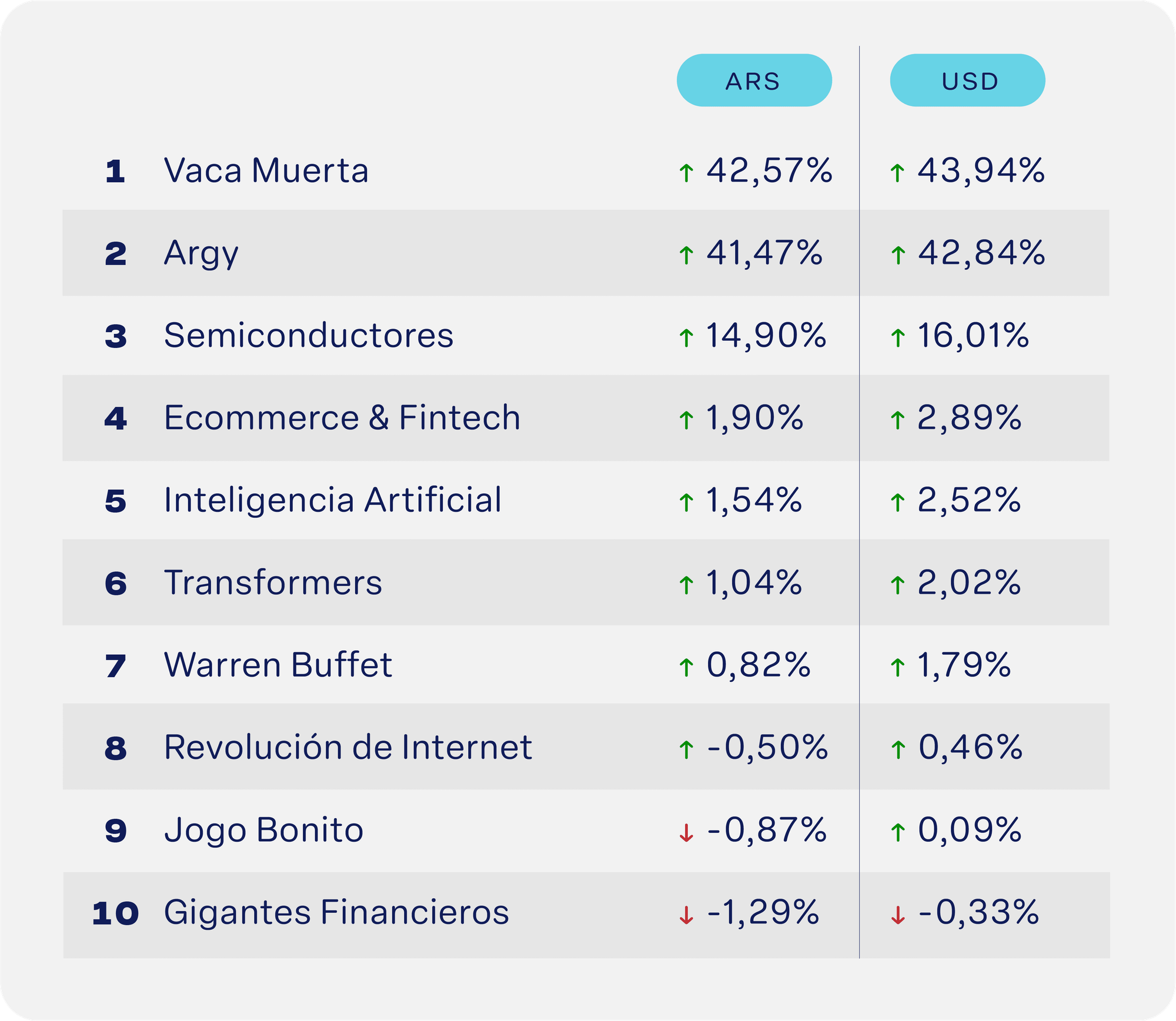 El pack más elegido por ustedes también fue el que mayor rendimiento generó. Vaca Muerta combinó un contexto internacional favorable para la energía con un salto extraordinario en las acciones locales motivado por el resultado de las elecciones. Este portfolio está diseñado para captura el sector productivo con más potencial del país, que lidera la transformación energética promete cambiar la balanza comercial para siempre.